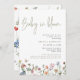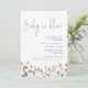 Um bebê neutro no tema Bloom convite para chás de fraldas. Este convite apresenta a manchete "Baby in bloom" em uma fonte verde verde e moderna, escrita à mão, e uma parte inferior de flores silvestres e borboletas aquáticas. O reverso apresenta um padrão de flores silvestres e borboletas. Personalize com seus detalhes.