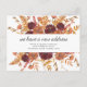 Este cartão postal de mudança de endereço de flores selvagens da moda apresenta uma moldura de abundantes flores e folhas de outono de cor vermelha escura e terracota em um fundo branco. As palavras "temos um novo endereço" aparecem em uma fonte elegante e moderna. Um anúncio de mudança simples e boho que você terá orgulho de enviar para amigos e familiares.