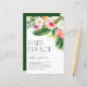 Convide os convidados para o seu evento com este convite personalizável de papelaria de brunch bebê. Apresenta ilustrações a aquarelas de folhas de palma, folhas de bananas, hibisco, plumeria e outras plantas tropicais. Personalize este convite para o bebê tropical adicionando nome, hora, data e outros detalhes do evento. Este convite para o bebê verde é perfeito para chás de fraldas de verão.