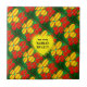 Cores vivas. Padrão de flores amarelas e vermelhas de 4 pétalas, com fundo verde. Coração amarelo felpudo com 2 suportes de texto personalizáveis. azulejo de excelente para decoração de Natal na cozinha. Parte da coleção Plethora de Padrões.