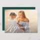 Cartão de foto de férias simples e elegante apresenta sua foto horizontal ou paisagem favorita em sangria total com "Rejubilar" sobreposto em letras de caligrafia branca tradicional. Personalize com seus nomes e o ano ao lado. Em seguida, adicione uma foto adicional e uma mensagem pessoal no verso, se desejar, em um fundo verde caçador festivo acentuado com pequenos flocos de neve brancos.