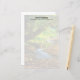 Papel de papelaria com uma floresta verde brilhante com um riacho enrolamento bonito. O castanho deixa cobrir o chão da floresta, proporcionando um bom contraste com a exuberante vegetação destas madeiras mágicas.