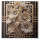 Um design floral de ouro definido dentro de um quadro quadrado, que é parte de uma estrutura maior em forma de grade. O arranjo floral apresenta várias flores grandes e estilizadas com centros texturizados e pétalas radiantes, intercaladas com folhas e caules. Toda a design tem uma haste metálica, sugerindo que poderia ser feita de metal fundido ou de um material semelhante.