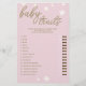 Uma folha de jogos elegante de "adivinhar as características do bebê" para uma festa de chá de fraldas de menina com um tema de margarida. O fundo rosa-pincelado-primavera é texturizado e em camadas com um padrão floral doce de margaridas brancas e amarelas.