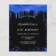 Por favor, note que este convite está no papel de folheto e é muito fino. Os envelopes não estão incluídos. Para convites mais espessos (mesmo design) visite nossa loja. Um convite de aniversário feminino e feminino de 21 ruas (ou qualquer idade). Na frente: Um fundo preto chic. Decorado com pingos de brilho azul real, com pingos de tinta pingando. Personalize e adicione um nome e detalhes da parte. O nome é escrito com um script de estilo manuscrito.