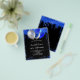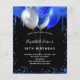 Um convite de aniversário feminino e feminino do 18º (ou qualquer idade). Na frente: Um fundo preto chic. Decorado com pingos de brilho azul-real, aparência pingando tinta e balões. Personalize e adicione um nome e detalhes da parte. O nome é escrito com um script de estilo manuscrito.