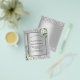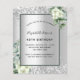 Por favor, note que este convite está no papel de folheto e é muito fino. Os envelopes não estão incluídos. Para convites mais espessos (mesmo design) visite nossa loja. Fundo de aspecto fino prateado decorado com flores brancas, flores, verde eucalipto e brilho falso prateado, faíscas. Personalize e adicione seu nome e detalhes da festa. Letras negras.