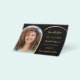 Observe que esta opção Save the date (Salvar a data) está no papel do folheto e muito fina. Os envelopes não estão incluídos. Para Cartões salve a data mais espessos (mesmo design) visite nossa loja. Uma foto Salve a data para uma comemoração de 40 anos (qualquer idade). Na frente: adicione sua própria foto de tamanho vertical. Um falso quadro de arco de fotos dourado. Um fundo preto clássico, texto de ouro. Modelos para um nome e data. O nome e o texto: Salvar a Data são escritos com um script de estilo moderno com letra manual. Voltar: detalhes da festa.