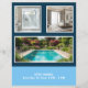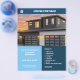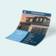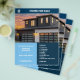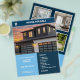 Um folheto com azulejos azuis, fotos personalizáveis e um ícone de uma casa para um agente imobiliário. Você pode usá-las para descrever sua propriedade com preço, uma lista de recursos e informações de contato. Há uma grande foto na frente e três fotos no verso.