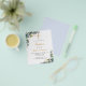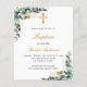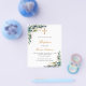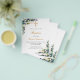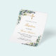 Um fundo branco decorado com verde de eucalipto e folhas de ouro e ouro. Personalize e o nome e os detalhes da cerimônia. Letras pretas e ouros coloridas. Verso: cor azul clara do fundo.