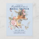 Bela raposa ilustrada aquarela, plumas boho, flores rosa poeira e burgundy apresentam neste convite de noivado que tem campos de modelo de texto em ambos os lados para adicionar todos os detalhes do evento.