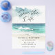 Budget Watercolor Beach Salve o Anúncio da Data - Uma bela praia de pristina com cor d'água com lindas ondas oceânicas turquesas. O convite orçamentário perfeito para uma praia, e para um casamento de destino. O convite apresenta uma tipografia moderna, escrita. O convite faz parte de uma coleção.