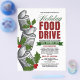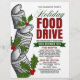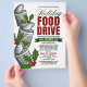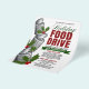 Folheto de arrecadação de fundos de caridade de Comida de Férias Minimalista com comida enlatada empilhada e emblemas verdes cobertos de neve. Destaque com cores de feriado ousadas e tipografia elegante.