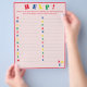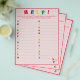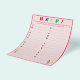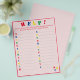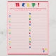 O design apresenta um fundo rosa pálido com uma borda e texto em vermelho brilhante. "SOCORRO!" é exibido no topo em cores brilhantes. As instruções são personalizáveis para um toque mais pessoal, se desejado. Os convidados são solicitados a listar nomes de meninas começando com a letra mostrada. Também disponível em azul. Projetado para coordenar com a "Coleção ABC de Chás de Bebê e Berçário".