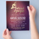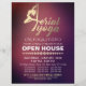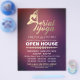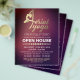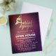 Modelo de Panfleto de Casa Aberta do Estúdio de Instrutor de Pilates Meditação YOGA Aéreo - Tipografia Elegante em Dourado de Pose de Yoga Aéreo e Tipografia Manuscrita em Fundo de Textura Vermelho Burgundy Roxo.