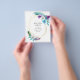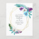 Folhas e orquídeas tropicais coloridas com cor d'água coloridas convite para casamento com moldura geométrica dourada e lavagem com cor d'água azul turquesa inversa. Ideal para um casamento de jardim ou qualquer tema. Por favor, note-se que este convite orçamental está no papel de folheto e é muito fino. Os envelopes não estão incluídos. Para convites mais espessos e produtos correspondentes no mesmo tema com envelopes inclusos, consulte a coleção abaixo.