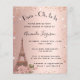 Por favor, note que este convite está no papel de folheto e é muito fino. Os envelopes não estão incluídos. Para convites mais espessos (mesmo design) visite nossa loja. Um convite moderno, na moda e glamouroso para um tema chá de panela e parisiense. Um fundo metálico rosa dourado falso com brilhos falsos e a torre Eiffel com algumas flores. O nome é escrito com um moderno estilo escrito à mão. Personalize e adicione um nome e detalhes da parte.