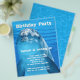 Convite de festa de aniversário com tema de golfinho impresso em papel acessível. Perfeito para meninos ou meninas que celebram uma festa de verão. Água azul e uma grande imagem de golfinho são o fundo para o texto personalizado em letras onduladas. No topo, o texto é "festa de aniversário" com um espaço abaixo para o nome e idade da criança. Todas as informações da festa são adicionadas em forma de parágrafo e podem incluir o que trazer e como responder. Você também pode escolher o tamanho menor.