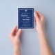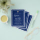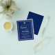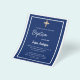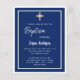 Um convite moderno e elegante. Um fundo azul marinho decorado com molduras brancas e uma cruz dourada. Personalize e adicione um nome e detalhes. Texto branco.