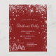 Fundo vermelho clássico, com brilho de purpurina prateada falsa e árvores de Natal brancas de inverno como decoração. Com o texto: Festa de Natal escrito com estilo de letra manuscrita grande moderno e trendy. Personalize e adicione as informações da sua festa.