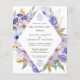 Lindas flores roxas e azuis empoeiradas criam uma moldura de diamante para cercar os detalhes da sua festa de noivado. Flores e folhas douradas abertas dão ao design um visual luxuoso.