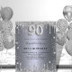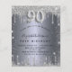 Um convite moderno, elegante e glamoroso para uma festa de aniversário de 90 anos. Um fundo com aparência de prata falsa, decorado com purpurina. Personalize e adicione seu nome e detalhes da festa. O número 90 é escrito com uma fonte estilo balão, manuscrita.