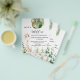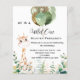 Por favor, note que este convite está no papel de folheto e é muito fino. Os envelopes não estão incluídos. Para convites mais espessos (mesmo design) visite nossa loja. Para o primeiro aniversario do bebê. Um fundo branco. Uma girafa de bebê e verde de eucalipto, samambaias e balões. Personalize e adicione o nome e os detalhes da festa. Texto: Selvagem Um