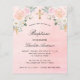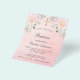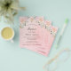 Um batizado moderno e elegante, celebrando uma menina. Um fundo rosa com pequenas faíscas douradas, pontos e uma cruz dourada. Flores cor-de-rosa e brancas e folhagem de eucalipto. Personalize e adicione um nome e detalhes da festa. Letras pretas. Letra cursiva elegante