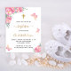 Um fundo branco decorado com flores cor-de-rosa e borboletas. Personalize com o nome da criança e detalhes da cerimônia. Letras pretas e douradas.