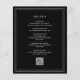 Estilo clássico preto tudo em um convite de casamento de orçamento (impresso em papel de folheto - envelopes não incluídos) com um design simples e mínimo com seu monograma no topo e seus detalhes de evento cercados por uma dupla borda. As fontes se alternam entre um script elegante, um serif tradicional e fontes sans serif minimalistas. A parte traseira tem seus detalhes de convidado junto com um Código QR opcional (se preferir, você pode remover o Código QR na ferramenta de edição de design). Este convite é excelente para um casamento formal.