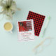 Convite para o Feriado de Natal Vermelho - com um celeiro vermelho nevado com uma coroa de Natal e uma luva de Natal. O fundo é branco rústico, madeira com agentes meteorológicos. Esta é a opção de valor. Se preferir um estoque de papel mais grosso, escolha nossa placa plana ou opções de cartão postal. A parte de trás do convite é a xadrez de búfalos vermelha e negra. Beverly Bainbridge Magnolia & Thistle E: bev@magnoliaandthistle.design