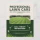 Um design de folheto promocional de cuidado profissional de gramados com uma foto personalizável de um gramado perfeitamente cuidado com padrões de corte de grama listrados, grama curta e elementos decorativos de flores e folhas. Pode ser adequado para pessoas que trabalham no setor de paisagismo, como paisagistas, cortadores de grama, manutenção de espaços verdes, jardineiros profissionais e serviços de cuidado de gramados, entre outros.