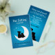 Modelo de folheto publicitário para profissionais de cuidados com animais, babás de animais, pet shops, abrigos ou clínicas veterinárias com ilustração fofa (logotipo) de gato e cachorro em azul.