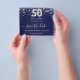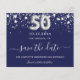 Observe que esta opção Save the date (Salvar a data) está no papel do folheto e muito fina. Os envelopes não estão incluídos. Para salvar o cartão Data (mesmo design) mais espesso, visite nossa loja. Uma cinta e moda Salve a placa Date para uma festa de aniversário 50th. Um fundo azul marinho colorido. Decorado com estrelas de falso prata. O texto: Salvar a Data é gravado com um script de estilo com letra de tendência grande. O número 50 é escrito com uma fonte no estilo do balão.