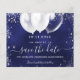 Observe que esta opção Save the date (Salvar a data) está no papel do folheto e muito fina. Os envelopes não estão incluídos. Para salvar o cartão Data (mesmo design) mais espesso, visite nossa loja. Uma garota e uma moda Salvem a data para uma Quinceañera, 15 festa de aniversário. Um fundo azul marinho incolor. Decorado com falso brilho prateado e balões brancos. O texto: Salvar a Data é gravado com um script de estilo com letra de tendência grande.