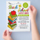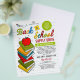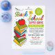 Promova suas costas para a unidade de distribuição escolar e rifa com esta ilustração de livros coloridos minimalista empilhados com maçã vermelha, lápis, avião voador, estrelas, nota de posto, fundo de papel e tipografia colorida. Personalize o modelo para seu gosto.