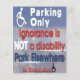 Um passageiro elegante que permite que os violadores de estacionamento deficientes saibam que a ignorância não é uma deficiência na frente e zonas de acesso = não há estacionamento no verso. Fácil de carregar com esses pequenos panfletos e grudar debaixo dos limpa-para-brisas ou em uma porta, pendurá-los em qualquer lugar. Belo panfleto, que recebe a nossa mensagem de respeitar o estacionamento para deficientes.