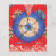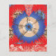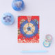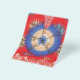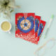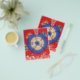 O design apresenta um padrão fractal espantoso. No centro, há um motivo circular em azul e branco, cercado por intrincados designs em tons de laranja, marrom e azul. O fundo é um vermelho rico com padrões de estrelas douradas espalhadas por toda parte. Este desenho fractal simétrico é visualmente cativante e simboliza frequentemente uma complexidade infinita, seja em matemática, natureza ou arte.