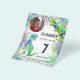 Um convite à festa de aniversário dino 7 para uma cor aquosa colorida para a criança que ama dinossauros. Estes colorido T Rex convidam os fãs de Dino para uma sétima festa de aniversário. Púrpura de cor verde-azul-rosa e cor d'água verde com Tyrannosaurus rex em verde-azul vibrante Personalize este design multicolorido Tyrannosaurus rex com uma foto, o número do aniversário e os detalhes da festa e você está preparado para um divertido e cheio de dinossauros com tema dino. Todas as espécies de dinossauros são bem-vindas. Ilustração original de arte por Catherine Sweetman