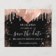 Observe que esta opção Save the date (Salvar a data) está no papel do folheto e muito fina. Os envelopes não estão incluídos. Para salvar o cartão Data (mesmo design) mais espesso, visite nossa loja. Um fundo preto decorado com rosa dourado, pinceladas, faíscas e balões. Personalize e adicione uma data e nome/idade. O texto: Salvar a Data é gravado com um script de estilo com letra de tendência grande.