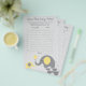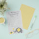 Use nosso jogo de elefantes amarelo e cinza chamado "adivinhem a canção do bebê" para jogar uma atividade divertida e interativa com seus convidados chás de fraldas. Faça uma lista de 10 músicas que exibam a palavra "bebê" e as toque para seus hóspedes e as faça adivinhar o título e o artista de cada música.