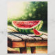 Hambúrguer suculento gigante sentado em uma mesa de piquenique com CHURRASCO de Verão e seu texto. As costas têm uma melancia cortada sentada numa mesa de piquenique.