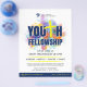 Promova os eventos do serviço de bolsas de juventude da sua igreja com este folheto minimalista e colorido com pinturas, cruz amarela e tipografia azul. Personalize de acordo com o seu gosto.