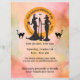 Crie o seu promocional no evento de caminhada das bruxas da sua cidade. Impresso com silhuetas de bruxas modernas e elegantes contra um logotipo laranja e fundo do estilo aquarela. Destacado com dois gatos pretos. Todo o texto é editável para os detalhes do evento. Outras opções de tamanho.