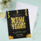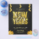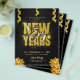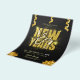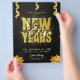 Anuncie a comemoração da Véspera de Ano Novo com este folheto, que apresenta fontes e planos brilhantes de ouro, óculos de champanhe, fitas de ouro e arcos em fundo preto. Personalize de acordo com o seu gosto.