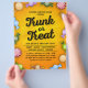 Promova seu evento Trunk ou Tratar o Dia das Bruxas com este folheto divertido com um quadro colorido de borda doce, um fundo de gradação de burst amarelo e tipografia robusta preta. Personalize o modelo para seu gosto.