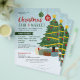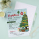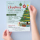 Anuncie sua feira de Natal e seu evento de festas de mercado com este folheto bonito com fundo azul de neve, um pinheiro de Natal verde decorado e presentes coloridos embaixo, e ornamentos verdes e vermelhos em flocos de neve.