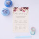 Faça seu chá de fraldas mais doce com esse jogo de adivinhação de Bonjour Bébé. Os convidados vão adorar combinar pistas inteligentes de temas infantis às suas doces favoritas nesta elegante folha de jogos, desenhada com tons rosas pincelados e flores de burgundy. Uma adição perfeita a um chá de fraldas inspirado em Paris. Parte da coleção Bonjour Bébé apresentada por Redwood & Vine Design Co.
