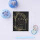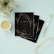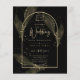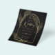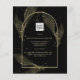 Apresentando um item de casamento de black tie formalmente elegante com cores preto e dourado adornado com delicadas folhas de esqueleto dourado sobrepondo as bordas de uma moldura arqueada. Este design faz parte de uma coleção coordenada e inclui itens como cartões de RSVP, avisos de save the date, convites, sinais de boas-vindas, adesivos, guardanapos, programas, cartões de número de mesa, sacos de lembranças, menus e rótulos de garrafa de vinho, bem como uma variedade de tipos de cartões e papéis para se adequar a qualquer orçamento.