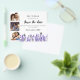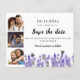 Observe que esta opção Save the date (Salvar a data) está no papel do folheto e muito fina. Os envelopes não estão incluídos. Para Cartões salve a data mais espessos (mesmo design) visite nossa loja. Decorados com flores de lavanda de cor aquosa. A Salve a data do seu casamento. O texto: Salvar a Data é gravado com um script de estilo com letra de tendência grande. Personalize e adicione 3 fotos.
